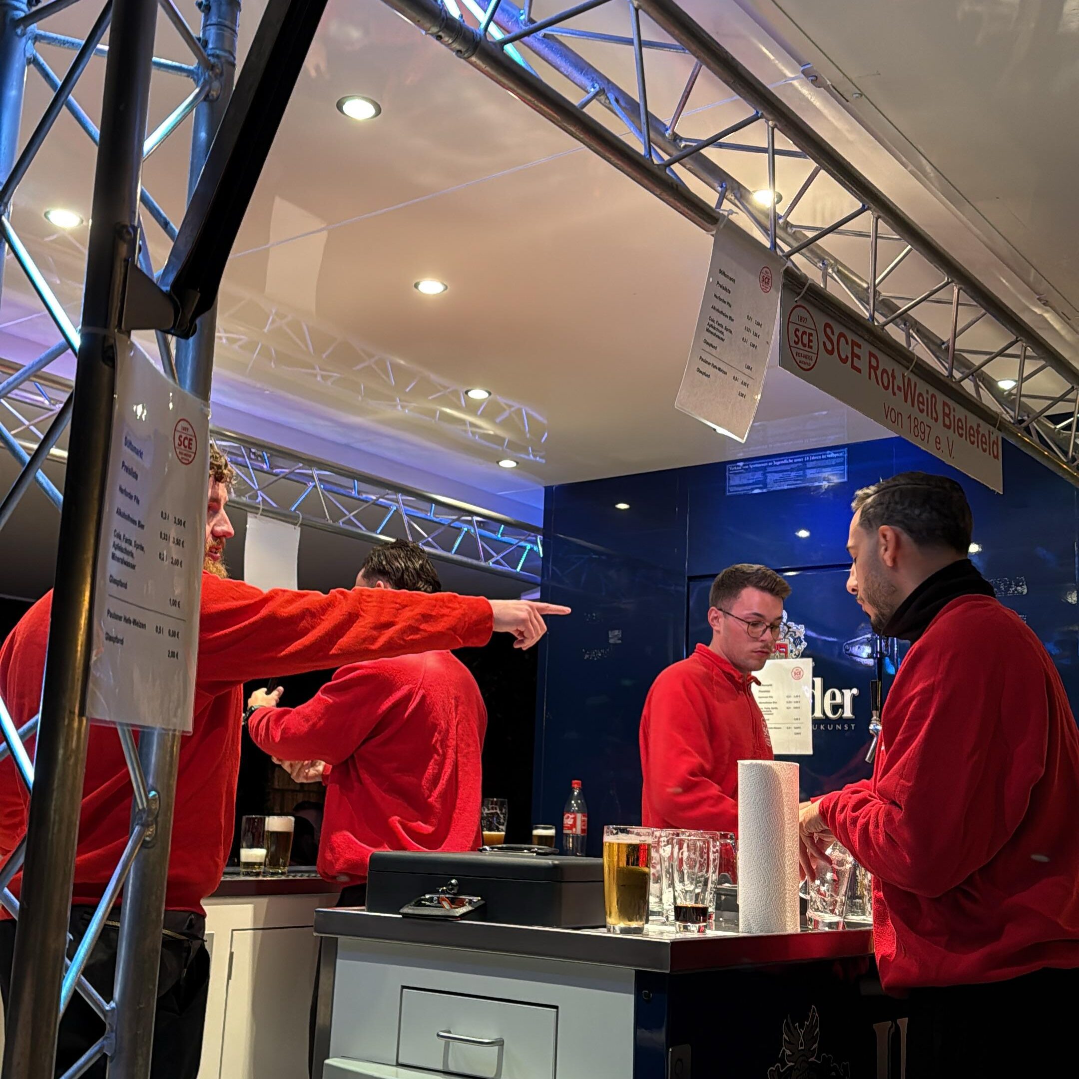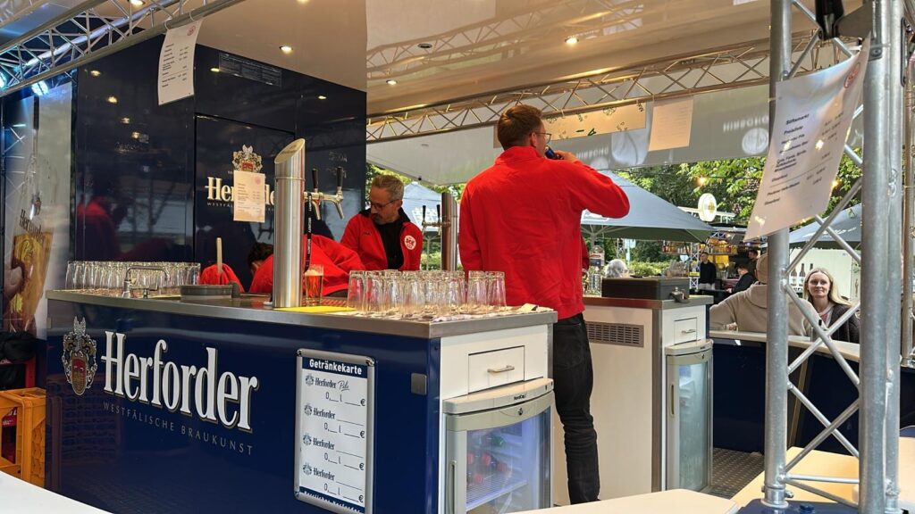 Auch in diesem Jahr war der SCE Rot-Weiß auf dem Stiftsmarkt in Schildesche vertreten. Trotz regnerischem Wetter herrschte am Getränkewagen beste Stimmung. Unsere Spieler präsentierten den Verein in den rot-weißen Pullovern – passend zu den Vereinsfarben.